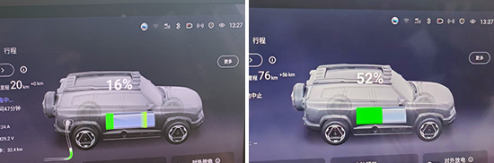 此外,对于充电效率我们也进行了测试。实测人员使用快充桩充电10分钟后(波峰用电),续航里程增加56km,充电功率最大为103.5kW,充电速度较快。