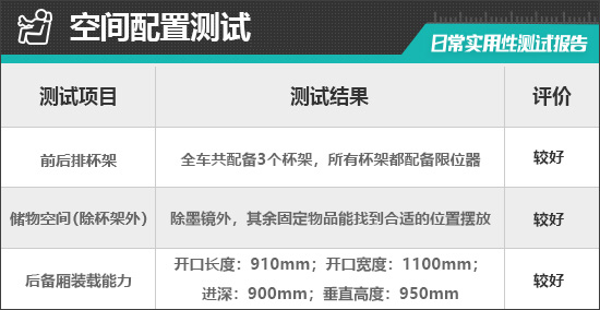 经过实测,除墨镜外,其余固定物品均有合适的储物空间进行摆放,并且位置设计合理,拿放物品方便。需要指出的是,评测车前排仅提供1个杯架,会给日常用车带来一些不便,还有待进一步优化。