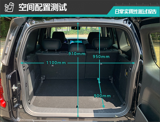 后备厢内部造型较为规整,地板平整度不错。后排座椅支持比例放倒,放倒后可以进一步拓展后备厢空间。对于评测车后备厢的基础数值,我们也进行了实测,开口长度为910mm;开口宽度为1100mm;后备厢进深为900mm;后备厢地台与顶部的垂直高度为950mm。