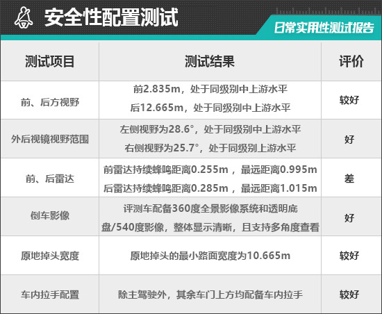 在车辆前、后方视野测试中,车内所有座椅均已调整至最低状态,所测出的数据与驾驶者正常使用时均有一些偏差,仅供参考。