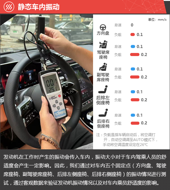 在静态车内振动测试环节,怠速状态下,方向盘处的振动数值为0,车内座椅的振动数值为0.1mm/s;负载状态下,方向盘和车内座椅的振动数值均有所上升,但幅度不大,对乘坐舒适性未造成影响。