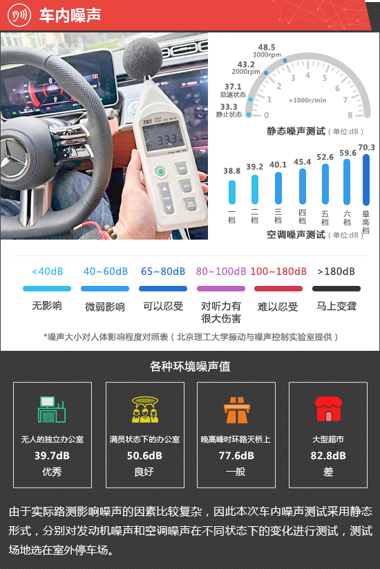 在静态噪声测试环节,评测车在静止状态下车内实测噪声值为33.3dB。随着发动机启动,传入车内的噪声值呈现出逐渐增大的趋势,从测试数据来看,发动机在怠速、2000转和3000转时,传入车内的噪声值分别为37.1dB、43.2dB和48.5dB,整体表现在测试过的同级别车型中处于上游水平。