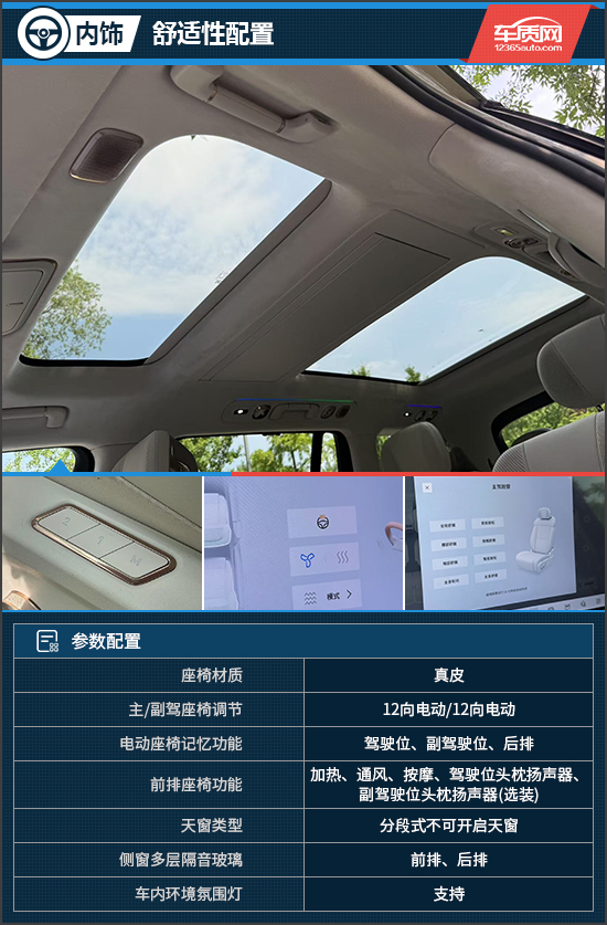 舒适性配置方面,评测车配备分段式不可开启天窗,前后天幕的尺寸都比较可观,能够提升车内的透光度,减少压抑感。三排座椅均提供了多向电动调节以及加热和按摩功能,实现三排乘客舒适性平权。此外,座椅记忆功能除了前排,第二排座椅也可以享受到,大幅提升了便利性。