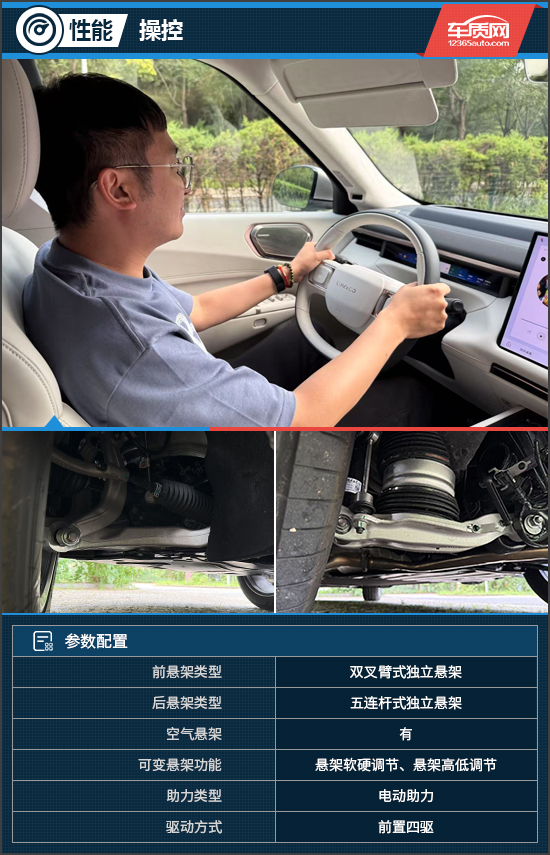 评测车的悬架系统由前双叉臂式独立悬架+后五连杆式独立悬架组成,优秀的物理结构加之Super AI数字底盘、闭式双腔空气悬架以及CCD连续阻尼控制系统等高阶功能,使其动态表现可以做到舒适与运动的平衡,让操控乐趣与家庭责任并存。