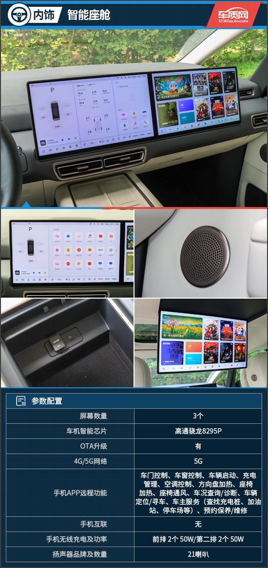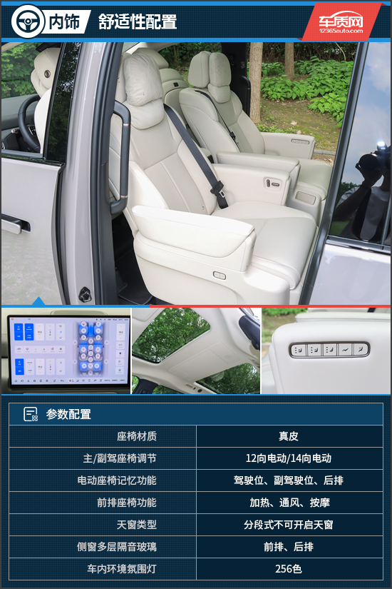 进入车内,新车依旧采用经典的家族式设计语言,配备小尺寸液晶仪表盘和双15.7英寸3K OLED屏。同时,车内触手可及的地方均采用软性皮质包裹,提升了档次感。白色的内饰也与温馨、居家的调性相符,细节全是好评。