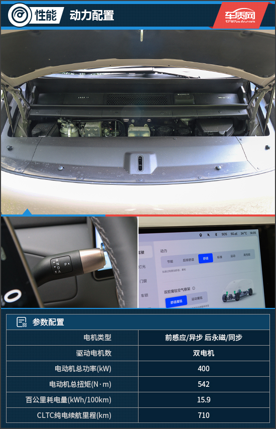 动力方面,评测车搭载双电机,电动机总功率400kW,总扭矩542N·m。匹配由宁德时代提供的三元锂电池,容量为102.7kWh,CLTC纯电续航里程710km。峰值充电功率520kW,官方宣称12分钟可补能500km。