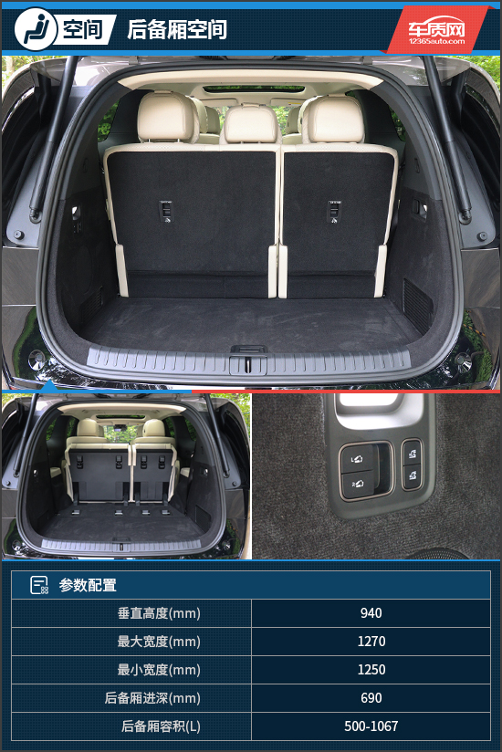 打开后备厢,在第三排座椅正常使用的情况下,容积为500L,摆放四个登机箱不成问题;将座椅放倒后还可以向前翻折,形成一个超大且规整的空间,容积可扩展至1067L,装载能力得到进一步提升。