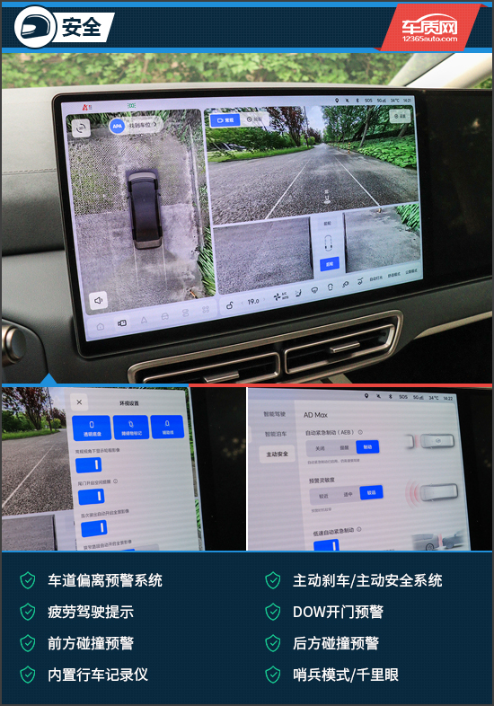安全方面,评测车拥有丰富的主/被动安全配置,包括车道偏离预警系统、主动刹车/主动安全系统、疲劳驾驶提示、DOW开门预警、内置行车记录仪以及哨兵模式/千里眼等。此外,评测车还配备360度全景影像,整体画质非常清晰,并且支持多视角查看,进一步提升安全性。