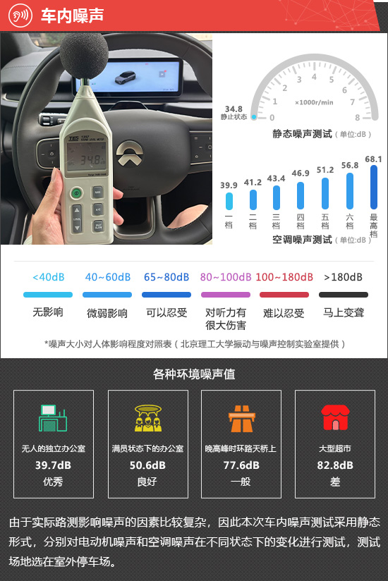 在静态噪声测试环节,2025款蔚来ES6在静止状态下车内实测噪声值为34.8dB。由于采用电动机驱动,车辆启动后不会出现明显的噪音。