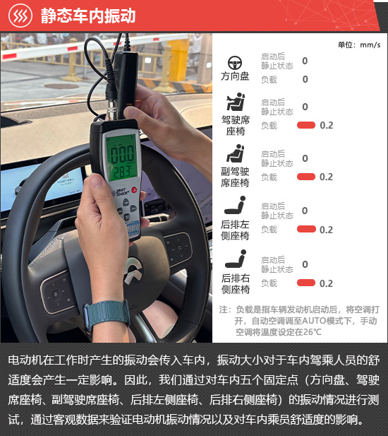在静态车内振动测试环节,启动后静止和负载两种状态下,评测车方向盘的振动数值均为0,前后排座椅的振动数值分别为0和0.2mm/s,实际体感轻微。