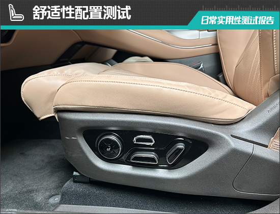 舒适性配置方面,评测车的前排座椅调节按键分别位于座椅左右两侧,位置合理且操作便捷,并均支持座椅记忆功能。同时,评测车前/后排座椅均提供加热、通风以及按摩功能,舒适性表现出众。