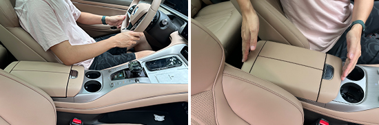 评测车前排中央扶手为对开式设计,采用了软质材质包裹,触感舒适。并且驾驶者在标准姿势驾驶时,可以为肘部提供支撑。