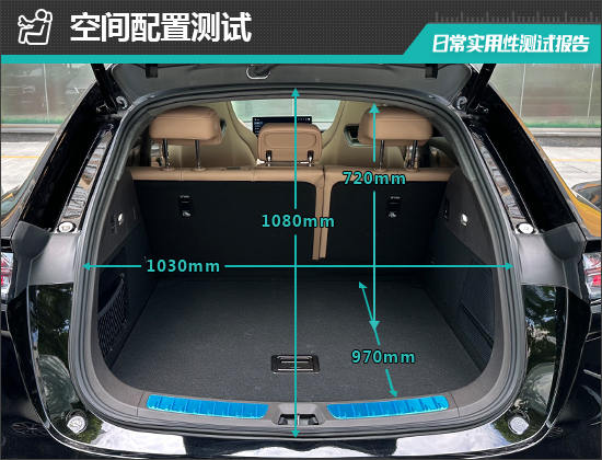 对于评测车后备厢的基础数值,我们也进行了实测,开口长度为1080mm;开口宽度为1030mm;后备厢进深为970mm;后备厢地台与顶部的垂直高度为720mm。