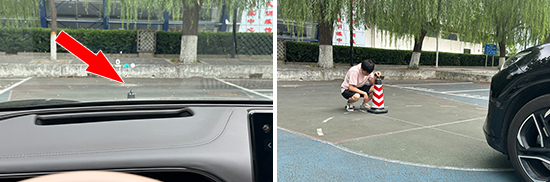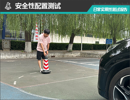 在前方视野测试中,我们采用高70cm的桩桶作为参照物,随后调整车距,直至在主驾驶位可以看到桩桶上沿。经过测试,桩桶与车头最终测得的数据为2.553m,在测试过的同级别车型中处于上游水平。