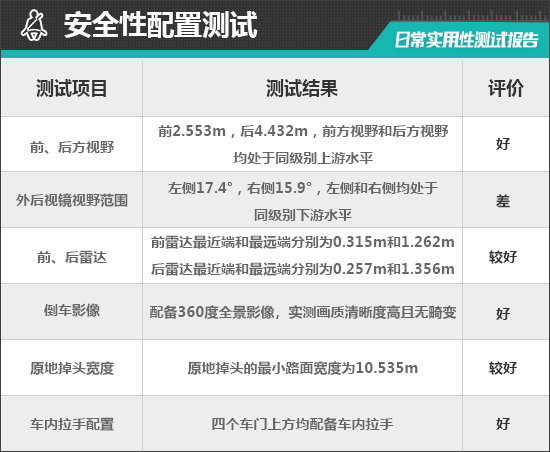 在车辆前、后方视野测试中,车内所有座椅均已调整至最低状态,所测出的数据与驾驶者正常使用时均有一些偏差,仅供参考。