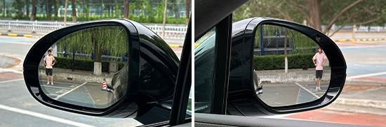 评测车的左/右外后视镜均采用了普通镜片,实测左外后视镜视野范围为17.4°,右外后视镜视野范围为15.9°,两侧外后视镜视野范围均处于同级别下游水平,视野盲区较大。