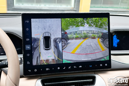评测车配备了360度全景影像以及透明底盘/540度影像,实测整体画质清晰且畸变情况合理。同时,画面支持多个角度查看,并配有可随动转向的倒车辅助线,能够减轻泊车时的压力。