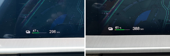 此外,对于充电效率我们也进行了测试。实测人员使用快充桩充电10分钟后(波峰用电),电量从47%充至61%,续航里程增加92km,与车辆电脑预计的用时基本吻合。