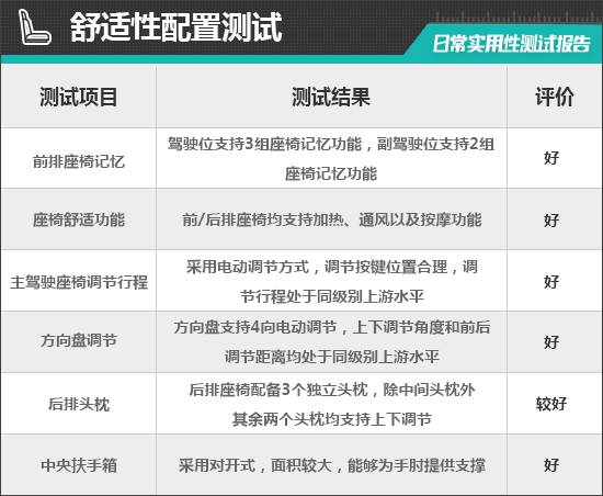 在主驾驶座椅测试中,评测车的主驾驶座椅最前端和最末端之间的距离达到270mm,在测试过的同级别车型中处于上游水平,能够满足绝大部分驾驶者的使用需求。