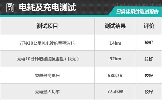 在实际测试中,将车内空调温度调至20摄氏度,驾驶模式为舒适。行驶路线途经城市道路和环路,平均车速为50±2km/h。到达目的地时,车辆表显的公里数增加10km,续航里程减少14km,即平均每行驶1km消耗的纯电续航里程约为1.4km。