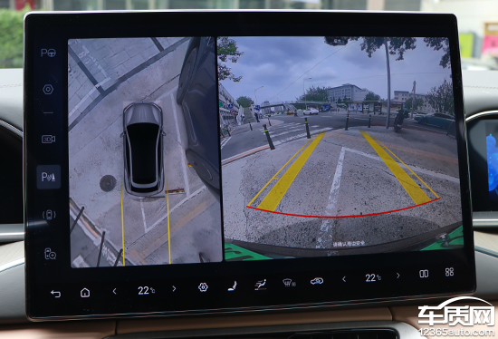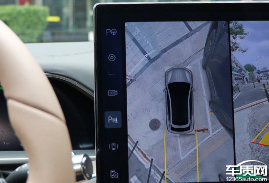 评测车搭载透明底盘/540°影像,支持多角度显示,并且3D视图的透明风格还支持半透和极简两种选择。实测来看,在白天光线条件比较充足的情况下,画面清晰度较为出色,畸变控制也能够令人满意。影像画面内带有可随动的倒车辅助线,另外影像画面的触发还能设置与低速转向进行联动,实用性表现可圈可点。