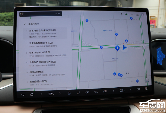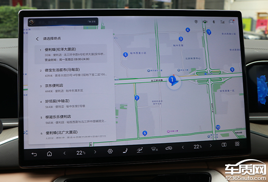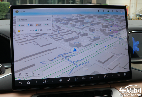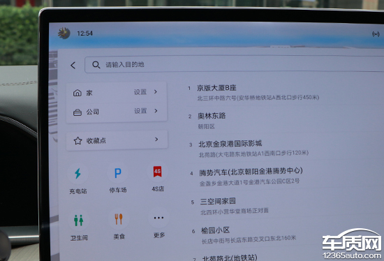 评测车内置高德地图,界面采用常规布局,搜索栏位于左上角,支持多种输入方式,日常操作简单方便。除了预设的家、公司以及收藏点外,导航还预设了很多快捷目的地选择,例如充电站、停车场以及4S店等。