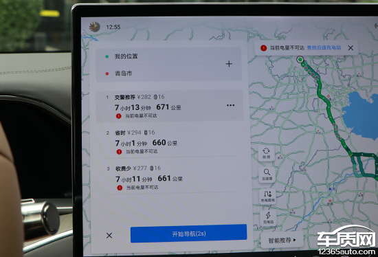 目的地信息显示较为丰富,确认后,系统会提供三条路线选择。基于车联网,导航界面可以显示路线的拥堵情况,为驾驶员提供参考。此外,作为一款纯电车型,其导航系统考虑得也十分周到,如果目的地行程较远,车辆剩余电量无法抵达,界面就会主动显示“当前电量不可达”。此时,用户只需点击“查询沿途充电站”,系统就能结合实际路线搜索沿途充电站并进行重新规划。