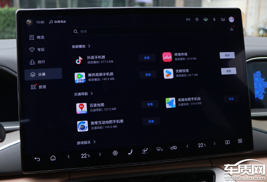 车机系统内置应用市场,APP数量较为丰富,并且在左侧快捷栏内还提供了精选、专区、排行以及分类的标签。实测来看,查找及下载APP的使用感受与手机端非常类似,操作简单方便。