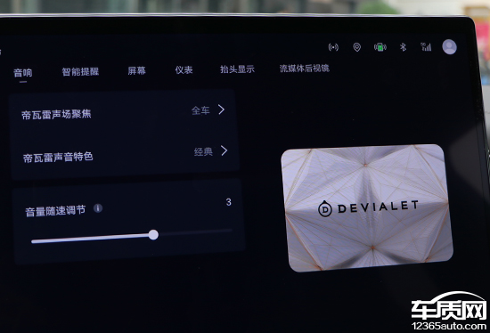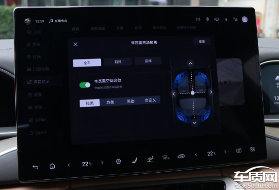 评测车搭载DEVIALET帝瓦雷音响系统,扬声器数量达到16个。不仅硬件配置较为出色,而且在软件层面,这套音响系统的可玩性也很高。系统内置帝瓦雷声场聚焦以及声音特色选项,除了选择预设方案还可以进行自定义。此外,这套音响系统也提供音量随速调节功能,实测效果明显,日常使用建议开启。