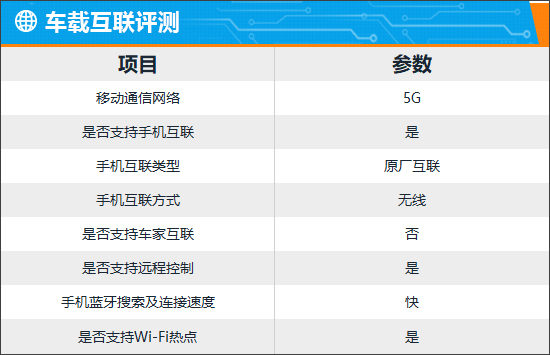 车载互联部分,评测车支持5G网络、车联网、OTA升级、Wi-Fi热点以及手机APP远程功能,配置表现十分主流。实测来看,手机蓝牙的搜索和连接速度都很不错,体验感较好。