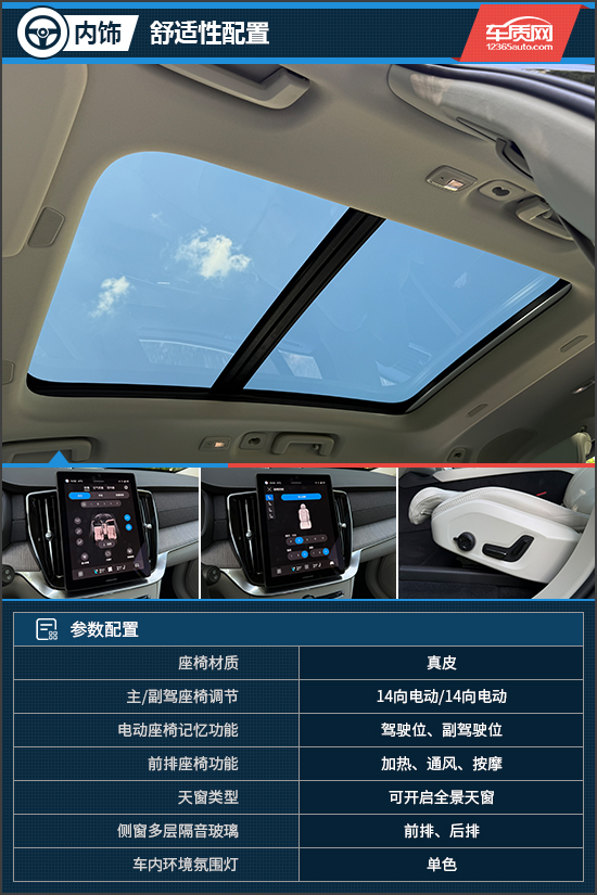 舒适性配置方面,评测车配备可开启全景天窗,尺寸可观,不仅能够减少车内的压抑感,还可以通风换气。前排座椅支持加热、通风和按摩功能,舒适性得以保证。此外,评测车还配备了双效增强型空气净化系统,PM2.5去除率超95%,花粉去除率超99.9%,空气传播病毒去除率超97%,为车内空气质量保驾护航。