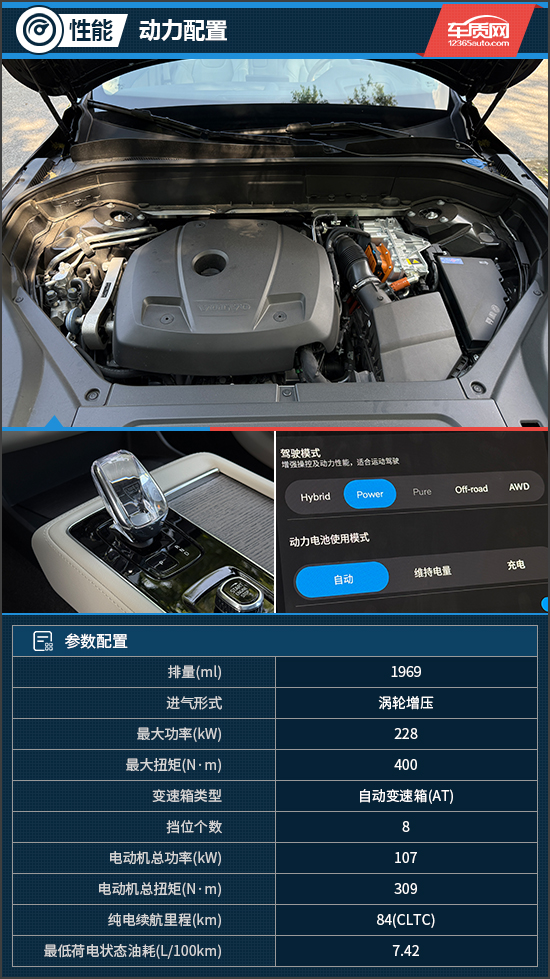 评测车搭载的插混系统由2.0T发动机+后置单电机组成,发动机最大功率228kW,最大扭矩400N·m;电动机总功率107kW,总扭矩309N·m。CLTC综合续航里程1329km,纯电续航为84km。与之匹配的传动系统为8速自动变速箱,并配备四驱系统。
