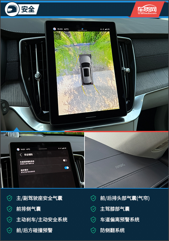 评测车配备的City Safety城市智能安全系统能够有效减轻或避免车辆和前方车辆、行人、骑行者以及大型动物相撞的危险,干预方式由人性化的听觉、视觉警告、方向盘转向辅助和紧急状态下启动的全速自动刹车功能组成。此外,被动安全配置也很齐全,对于车内人员的安全防护到位。