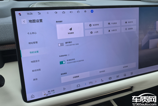 地图设置界面美观简洁,内容包含地址管理、导航设置、地图显示等,设置中,用户可以灵活设置路线偏好、导航信息播报丰富程度等,稍显不足的是,并未提供不同语音播报供用户选择。值得一提的是,车辆支持AR实景导航,画面可以呈现在HUD当中。