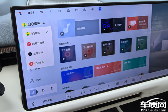 虽然评测车没有提供FM调频广播,但提供了喜马拉雅、云听这类网络广播,且平台音频内容涵盖面也比较广。此外,评测车还有QQ音乐、网易云音乐、蓝牙音乐、USB音乐等不同音源可供选择,满足用户的音频收听需求。