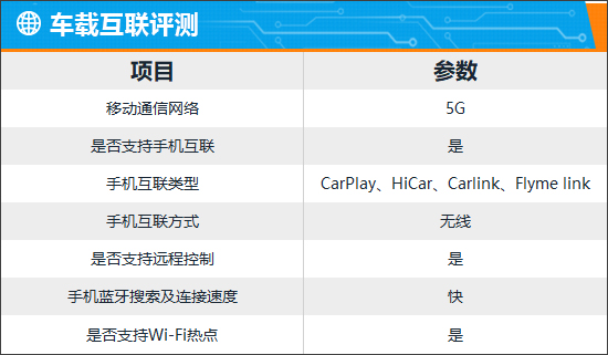 车载互联部分,评测车配备车联网、Wi-Fi热点以及手机APP远程功能。实测来看,手机蓝牙的搜索及连接速度都相当不错,日常使用较为方便快捷。手机互联方面,系统支持CarPlay、HUAWEI HiCar、Carlink、Flyme link等多种互联/映射方式,种类非常丰富。