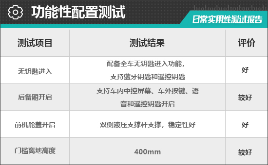 对于消费者来说,门槛离地高度一定程度上决定了上下车便利性。根据实测结果来看,评测车的门槛离地高度为400mm,达到同级别车型中游水平,驾乘人员日常上下车比较便捷。