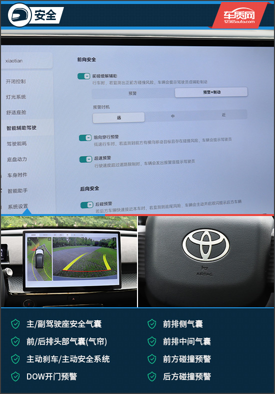 安全配置方面,铂智3X继承了丰田一直以来的安全、安心。评测车搭载了丰富的主/被动安全配置,像是主/副驾驶座安全气囊、前/后排头部气囊(气帘)、前排中间气囊、DOW开门预警、后方碰撞预警等主/被动安全配置均有配备,可以有效提升行车安全性。