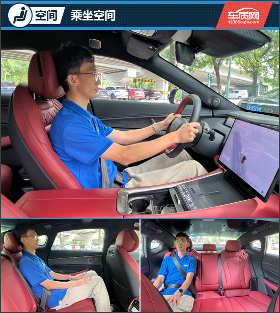 乘坐空间方面,身高为178cm的体验者分别进入前/后排,此时腿部和头部均有不错的余量。同时,后排座椅配备了三个头枕,内部填充物柔软适中,枕靠在上面较为惬意。