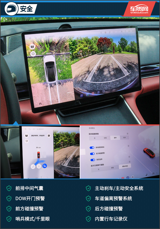 安全方面,评测车拥有丰富的主/被动安全配置,包括车道偏离预警系统、主动刹车/主动安全系统、前方碰撞预警、哨兵模式/千里眼以及内置行车记录仪等。此外,评测车还配备了360度全景影像,整体画质非常清晰,使用体验较好。