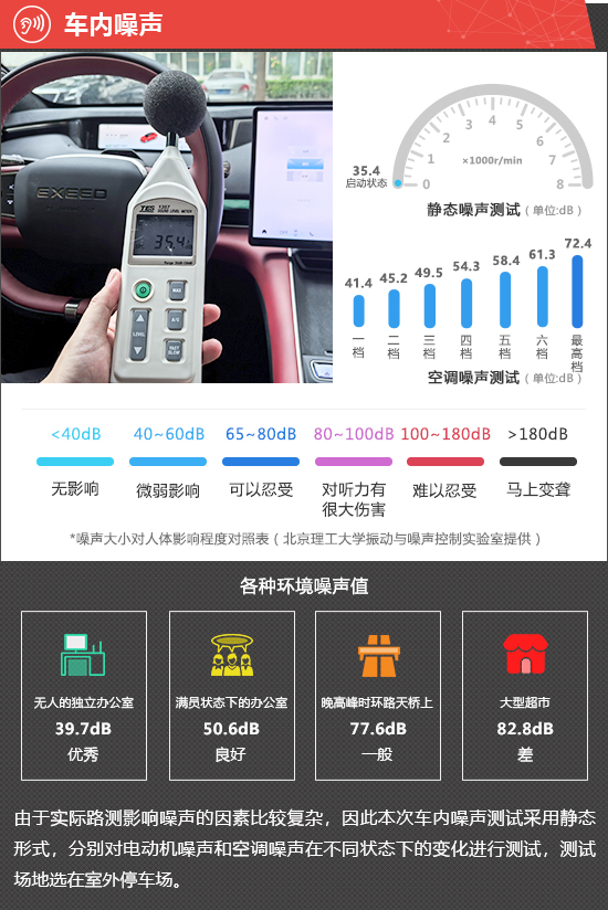在静态噪声测试环节,星途星纪元ES增程在启动状态下车内实测噪声值为35.4dB,在测试过的同级别车型中处于中游水平。