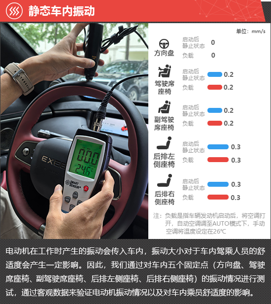 在静态车内振动测试环节,启动后静止和负载两种状态下,星途星纪元ES增程方向盘位置的振动数值始终为0。前排座椅的振动数值均为0.2mm/s,后排座椅的振动数值均为0.3mm/s,两种状态下数值保持不变,实际体感不明显。