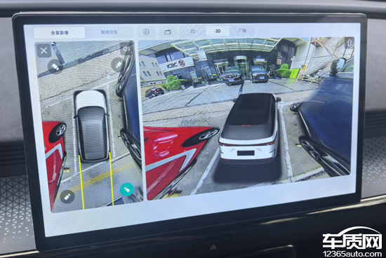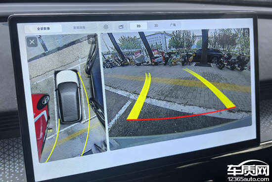 评测车配备360度全景影像,并带有透明底盘/540度影像,支持多角度显示。实测来看,在白天阳光比较充足的条件下,画质清晰度也很高。畸变控制较为出色,只有在特殊的3D视角下,画面边缘的畸变才会比较明显。此外,倒车影像画面内还带有可随动的倒车辅助线,当距离障碍物较近时还有车距显示,实用性较强。