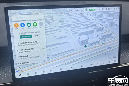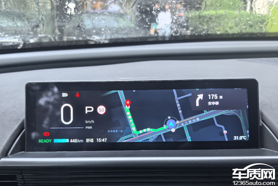 评测车内置高德导航,熟悉的界面以及操作方式和手机移动端相似程度很高。作为一款纯电车型,其在导航界面内支持快速查找充电站,并且还能根据目前的续航里程计算出地图上的可行驶范围。开始导航后,导航信息会同步至仪表屏,对于驾驶者来说很实用。