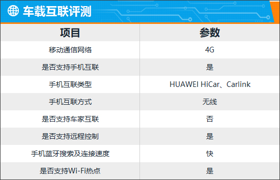 车载互联部分,评测车配备4G网络、Wi-Fi热点以及手机APP远程功能。实测来看,手机蓝牙的搜索及连接速度都相当不错,日常使用较为方便快捷。手机互联方面,系统支持HUAWEI HiCar、Carlink等互联/映射方式。