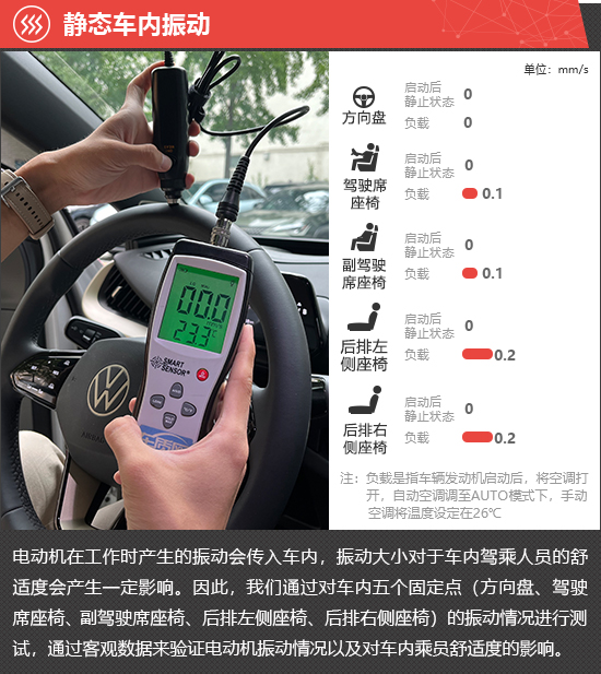 在静态车内振动测试环节,启动后静止状态下,五个固定点测得的振动值均为0。在负载工况下,方向盘处的振动值仍保持为0;前排和后排座椅的振动值虽略有上升,但实际体感并不明显。