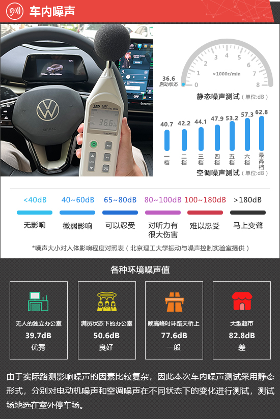 在空调噪声测试环节,先将测试仪器置于距空调出风口大约10cm的位置,然后将空调风量由小到大依次调高,并测量在不同档位下驾驶员位置的噪声值。经实测,2025款与众06的空调调节共分7档,开启最高档时测得噪声值为62.8dB,成绩在此前测试过的同级别车型中处于中上游水平。