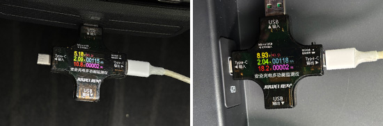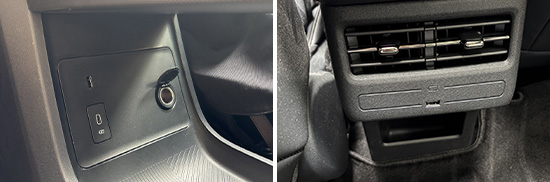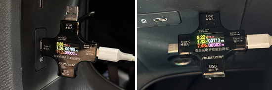 在车内USB接口方面,评测车前后排均配有1个USB Type-A接口和1个USB Type-C接口,1个12V电源位于中控台下方。此外,我们对USB接口进行了测试,前排USB Type-A接口的测试成绩为5.22V、1.42A、7.48W左右,USB Type-C接口的测试成绩为8.88V、1.26A、11.2W左右;后排USB Type-A接口的测试成绩为5.18V、2.09A、10.8W左右,USB Type-C接口的测试成绩为8.93V、2.04A、18.2W左右。