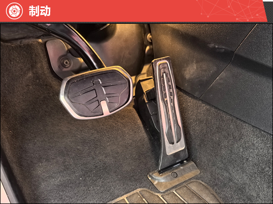 评测车标配红色四活塞前制动卡钳,搭配大尺寸通风盘,制动力线性且强劲。制动踏板初段基本没有虚位,轻踩便能获得明显的制动力,整个制动过程中车身姿态也十分平稳,带给人充足的信心。