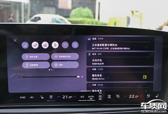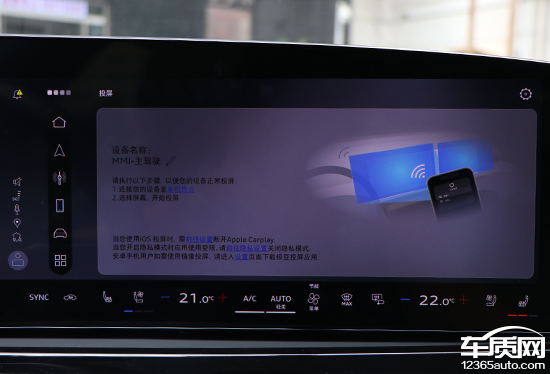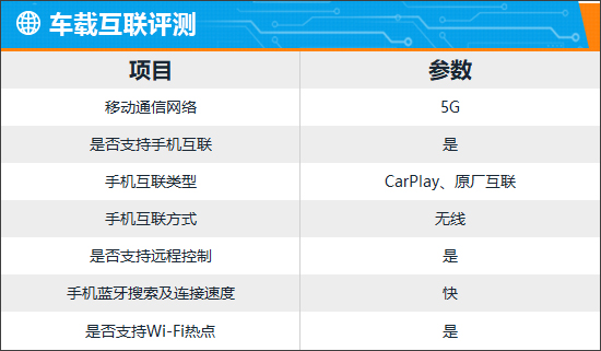 车载互联部分,评测车支持5G车联网以及手机APP远程功能,实测蓝牙的搜索及连接速度均相当不错,体验感较好。手机互联方面,系统支持CarPlay和原厂互联,基本能够满足日常使用所需。此外,评测车还内置投屏功能,可以通过车机热点进行连接。
